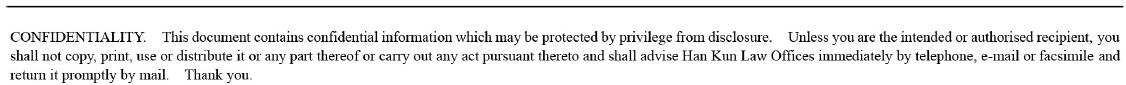 This opinion is issued based on our understanding of PRC Laws. For matters not explicitly provided under PRC Laws, the interpretation, implementation and application of the specific requirements under PRC Laws, as well as their application to and effect on the legality, binding effect and enforceability of certain contracts, are subject to the final discretion of competent PRC legislative, administrative and judicial authorities. Under PRC Laws, foreign investment is restricted in certain industries. The interpretation and implementation of these laws and regulations, and their application to and effect on the legality, binding effect and enforceability of contracts such as the VIE Agreements and transactions contemplated by the VIE Agreements, are subject to the discretion of the competent Governmental Agency. |